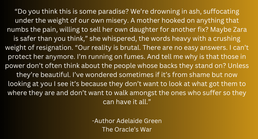 We are then drawn into the life of Zara, a young woman struggling to survive in the slums of Neighborhood C. She always has her face hidden in masks and scarves, even when it is much too hot. She is having a witty conversation throughout with her best friend and inner voice Solara. After losing her mother and sister in a market raid, she’s taken in by the seemingly kind Mother Jabiil, only to discover a horrifying truth: Jabiil’s home is a brothel, where women are treated as commodities, called different flower names and Zara is given one of her own. Stripped of her inner voice, Solara, Zara navigates this new reality, reconnecting with her childhood friend Amo, with whom she sees in new light and starts a sweet love relationship with. She also encounters Prince Amir, the brother not meant to rule, and the enigmatic Omar, whose connection to the library and its resident dragon, Eldara, proves crucial. Each of them is unknowingly a key player in the unfolding prophecy, and one by one, the Oracle reveals their supposed roles.